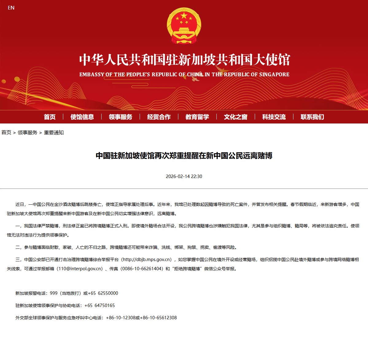 Statements released by the Embassy of the People's Republic of China in Singapore and the Embassy of the People's Republic of China in Vietnam reminded citizens to comply with local laws while also highlighting China’s domestic restrictions on gambling and cross-border gaming promotion.